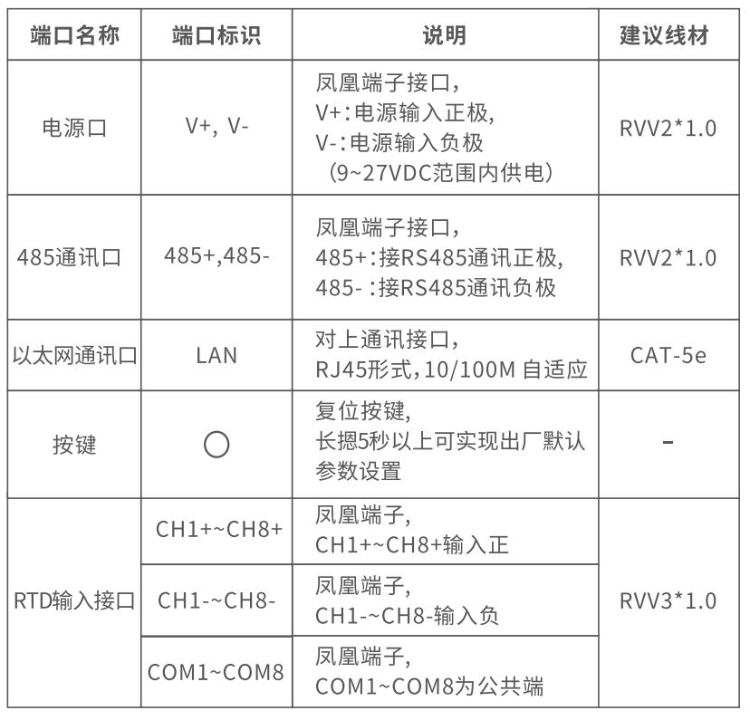 | 输入参数 | 输入类型 | 8路Pt100/Pt1000/Ni1000(软件可配置输入类型,默认Pt100) |