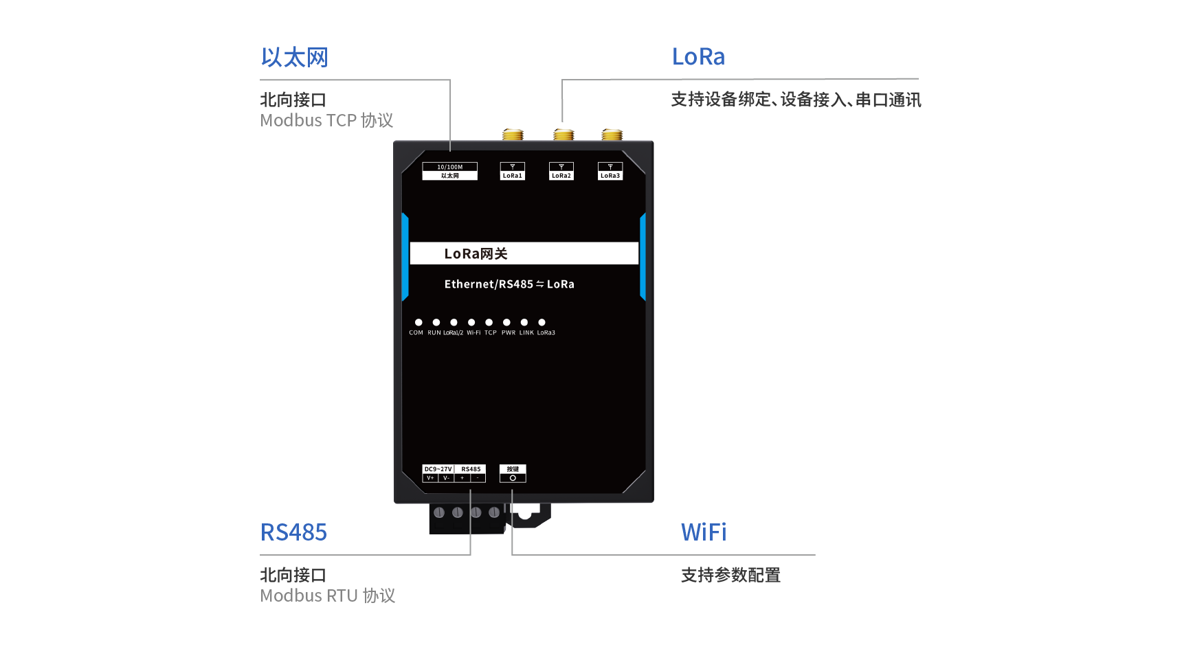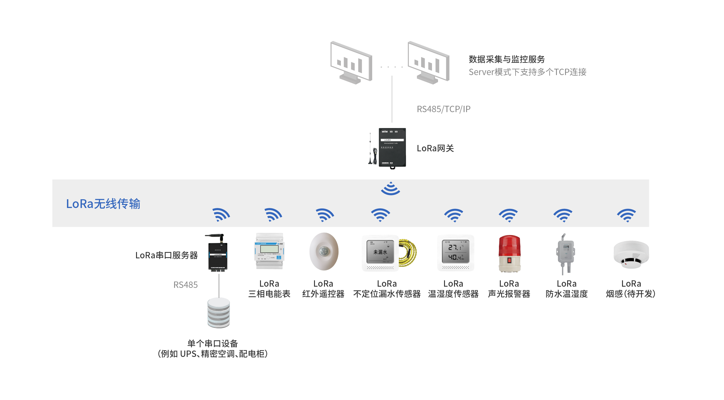 LoRa网关对上提供网络和RS485通讯接口,支持Modbus TCP和Modbus RTU协议。