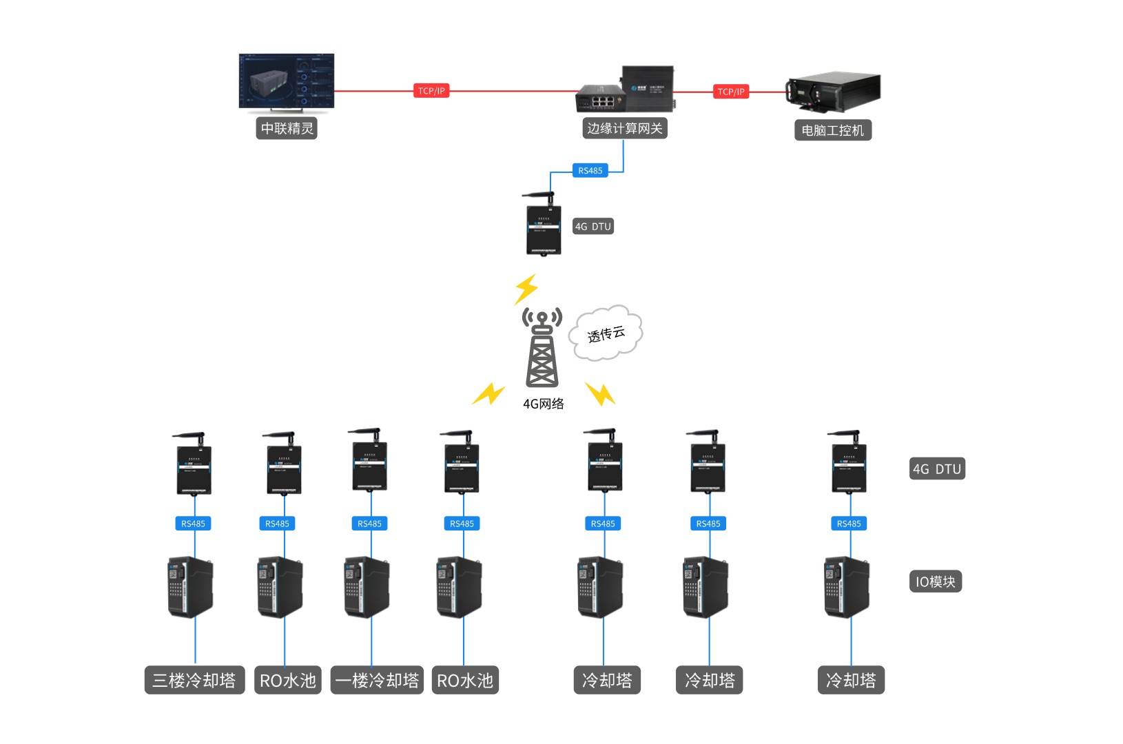 面对客户的需求,我们的技术人员在了解了客户现场实际情况后,结合康耐德产品特性,为客户推荐了由边缘计算网关、4G DTU、IO模块等设备组成的控制管理方案。