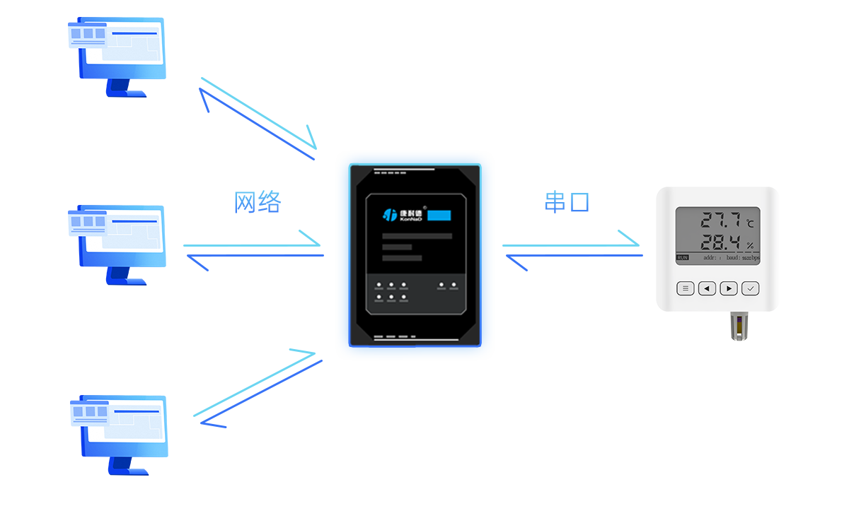 对上提供以太网接口,实现 RS232/422/485 与以太网口双向数据传输,支持Modbus/MQTT/HTTPD协议,同时具备预置命令,命令缓存等功能。
