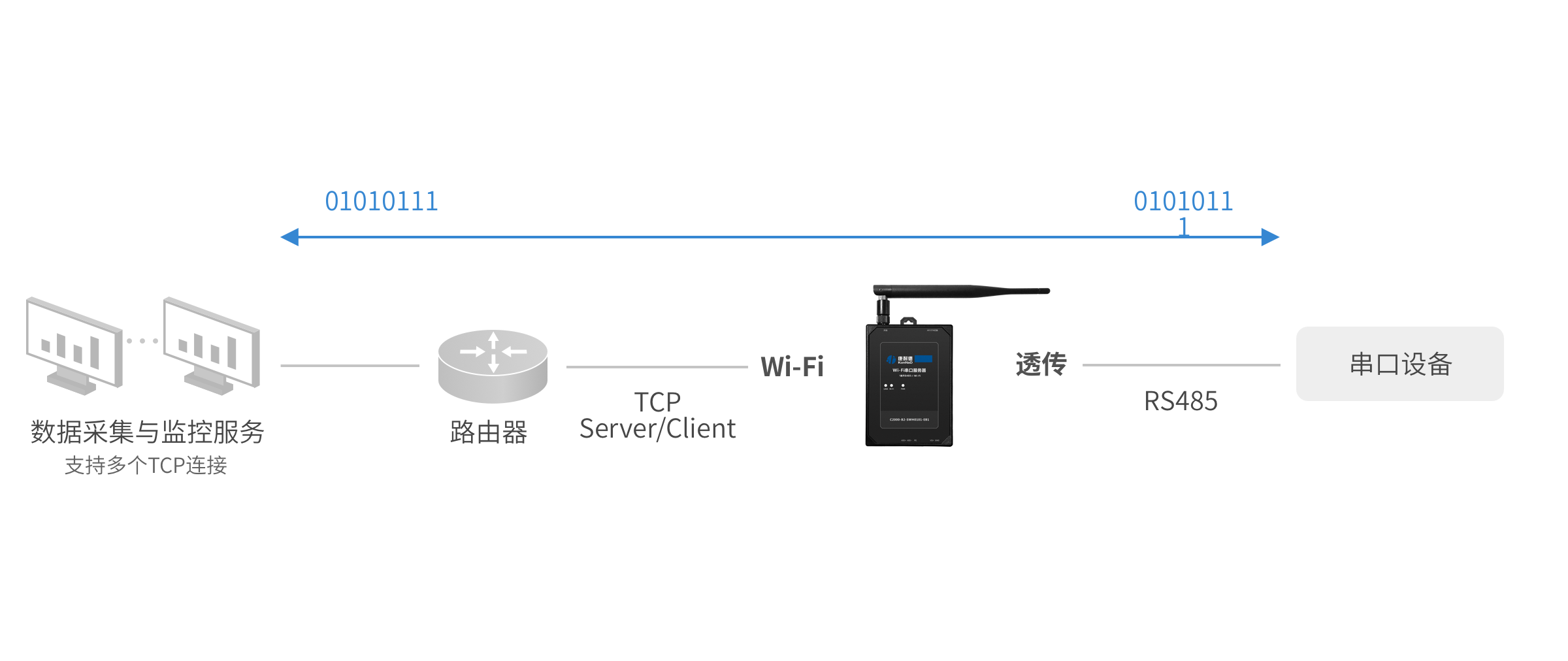 对上提供 Wi-Fi 无线传输,实现 RS485 与Wi-Fi双向透明传输